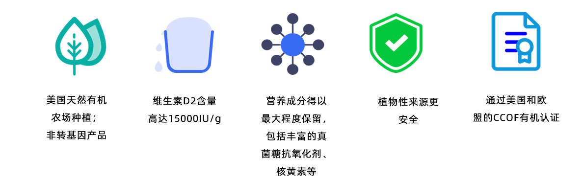 本品原料選用從美國Monterey Mushrooms®(蒙特利) 白蘑菇粉提取的天然維生素D。