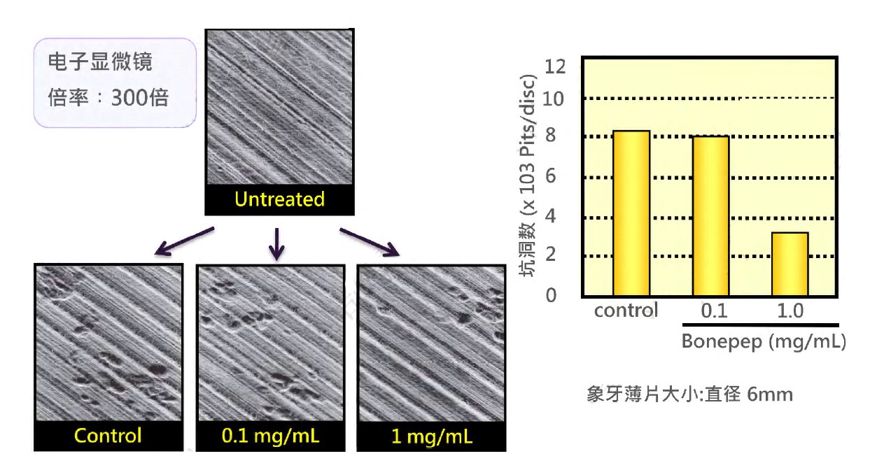 注:與對照組相比,BonepeTM能抑制破骨細胞的骨吸收,顯著減少骨骼表面破損凹洞數量