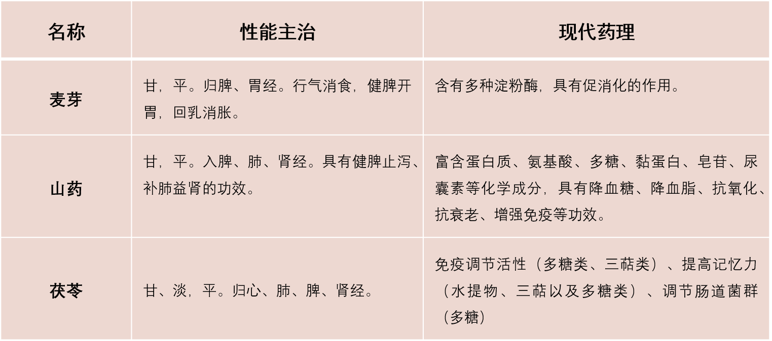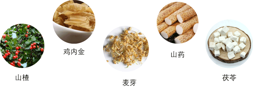 主要營養原料:山楂粉(5%)、雞內金粉(1.4%)、麥芽粉(0.7%)、山藥粉(1.4%)、茯苓粉(1.4%)