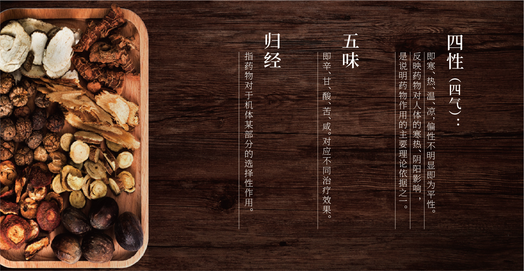 ——“四性” (四氣):即寒、熱、溫、涼,偏性不明顯即為平性。反映藥物對人體的寒熱、陰陽影響,是說明藥物作用的主要理論依據之一。