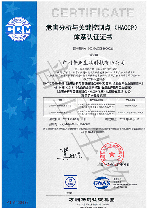 2019年2月18日,普正生物收到了《危害分析與關鍵控制點(HACCP)體系認證證書》,這是由國家認證認可監督行政主管部門批準,由北京方圓標志集團進行嚴格檢查審核并頒發的權威認證證書,有效期三年。