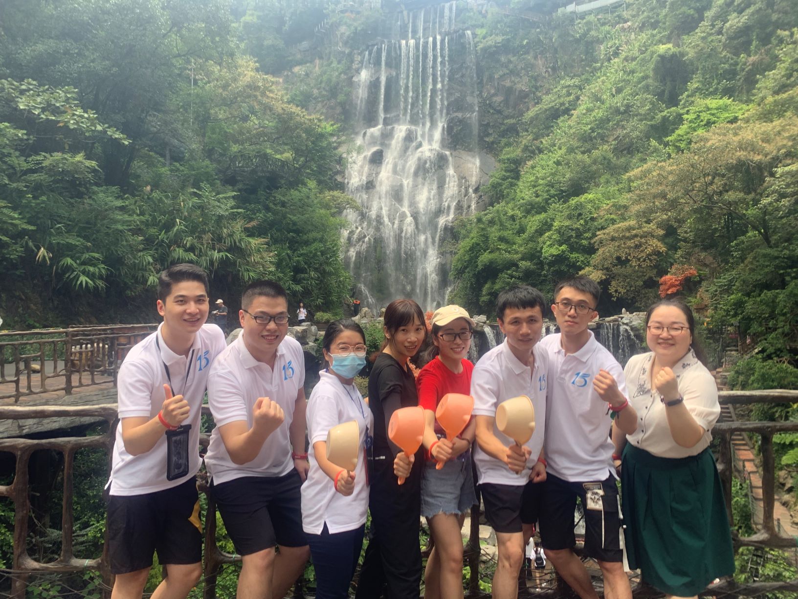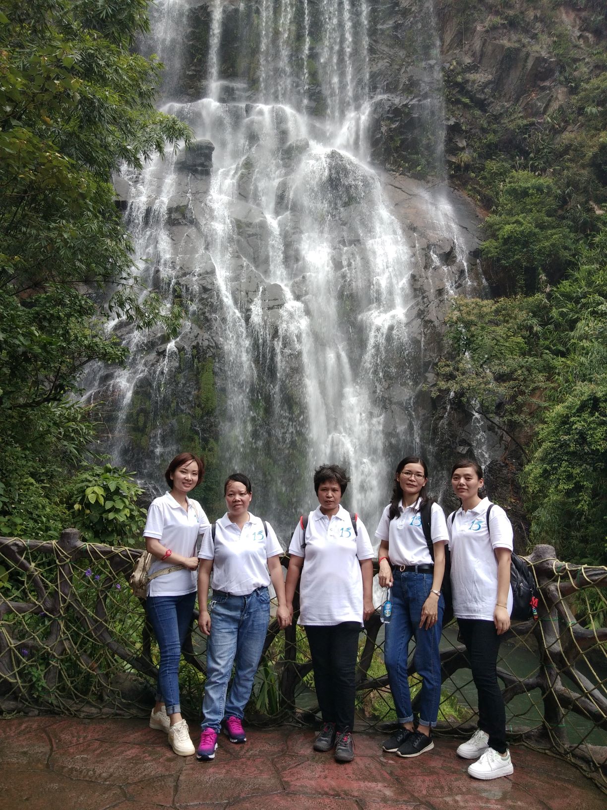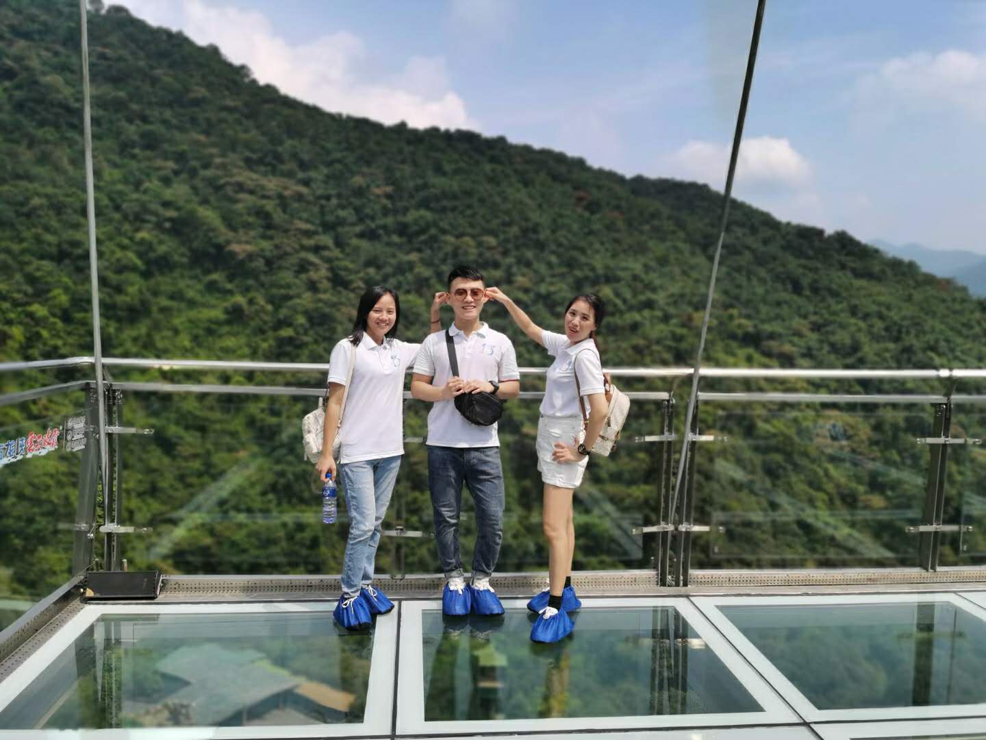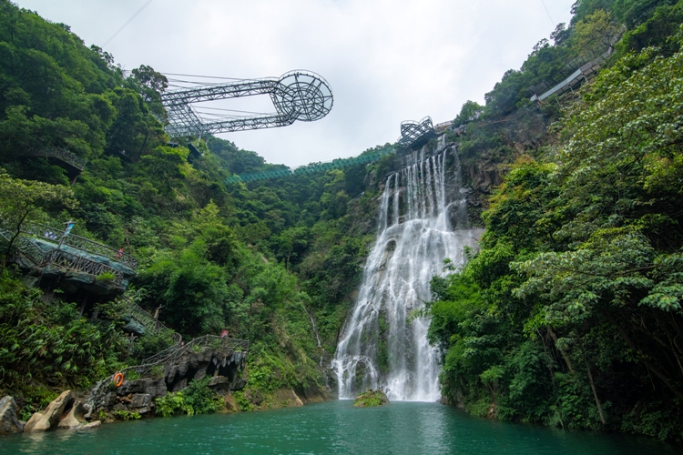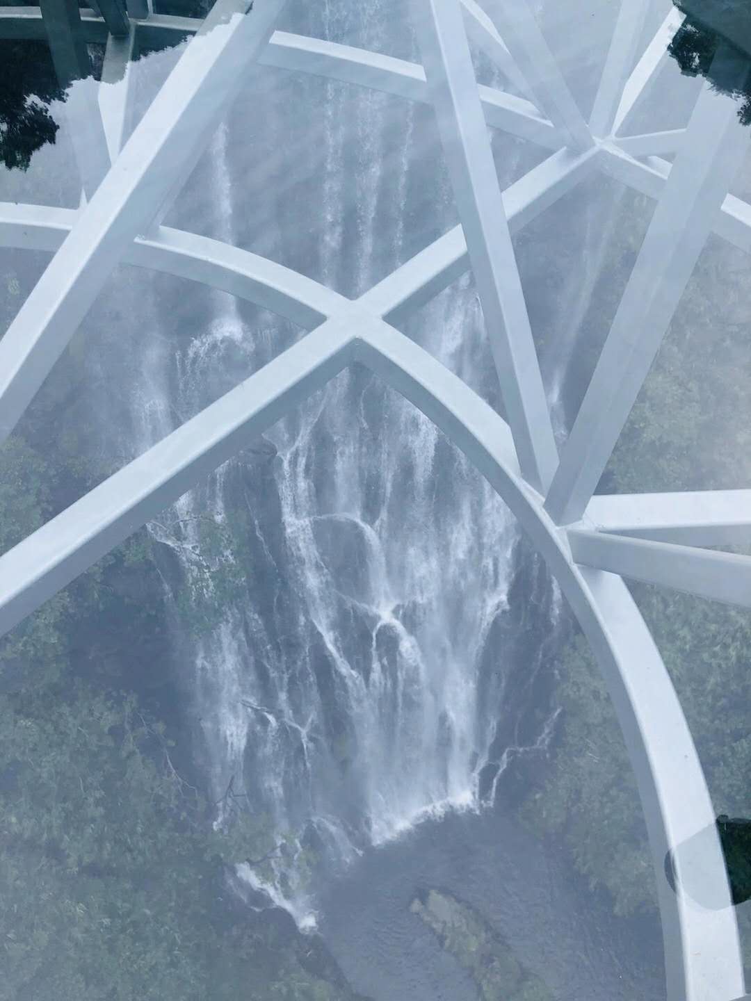 第一站是玻璃大峽谷。小伙伴們一路浩浩蕩蕩,沿著林間小路拾級而上,這里樹木郁郁蔥蔥,層層疊疊的深綠淺綠令人應接不暇,再加上無數白練飛漱其間,水霧彌漫,清幽醉人。帥哥美女們一路談笑風生,一路擺拍錄影,想把滿山的美景和此時此刻的好心情定格帶回家!
