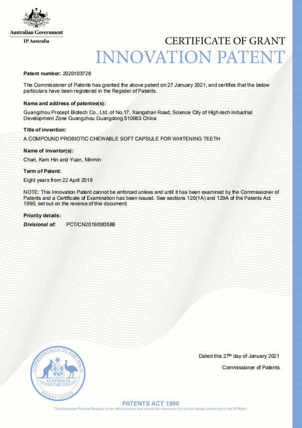 普正生物作為一家長(zhǎng)期致力于研發(fā)的技術(shù)型公司,普正生物自2005年創(chuàng)立以來(lái)收獲了一眾專利與榮譽(yù),最近又喜獲了一項(xiàng)新的國(guó)際發(fā)明專利——口腔益生菌專利證書--澳大利亞