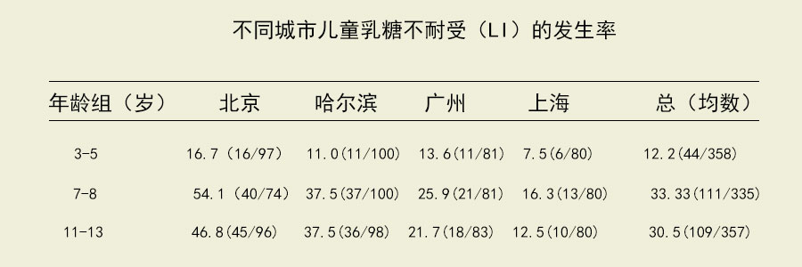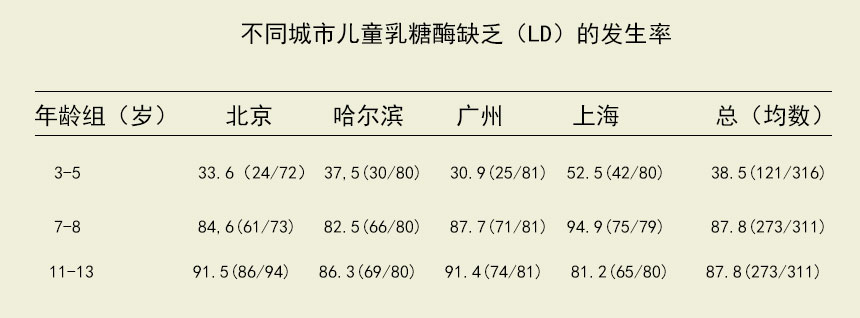 小孩子發(fā)生這種癥狀并不少見。1999年中國營(yíng)養(yǎng)學(xué)會(huì)楊月欣等在哈爾濱、北京、上海和廣州四大城市對(duì)3—13歲兒童隨機(jī)抽取1168名,進(jìn)行乳糖不耐測(cè)試,結(jié)果表明, 我國兒童乳糖不耐缺乏(LD)的發(fā)生率有隨年齡增長(zhǎng)而升高的趨勢(shì),發(fā)生率在兩位數(shù)以上。